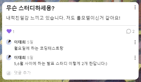 - 다들 좋게 봐주기 때문에 - 부디 자기소개도 알차게 잘하고, 자신과 잘 맞는 스터디에 들어갈 수 있는 확률도 높였으면 좋겠다. (사실 이건 사회생활 어디에서나 마찬가지인 것 같다.)