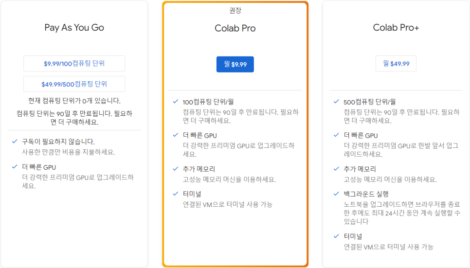 GPU와 TPU도 colab-pro가 더 고성능인 것으로 알려져 있습니다.