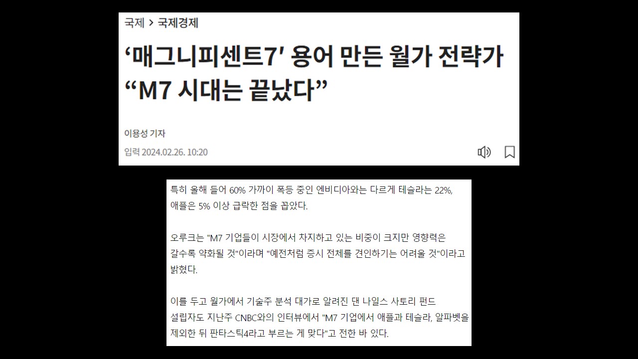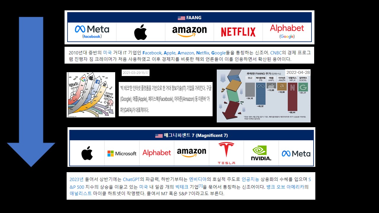 과거에는 FAANG(Facebook, Amazon, Apple, Netflix, Google)이 주목받았다면, 현재는 AI 기술의 부상으로 새로운 "Magnificent 7"이 주도하고 있습니다. 이 그룹은 애플, 마이크로소프트, 알파벳, 아마존, 메타, 엔비디아, 테슬라로 구성되어 있으며, 엔비디아는 특히 AI 칩 시장에서 두각을 나타내고 있습니다.
