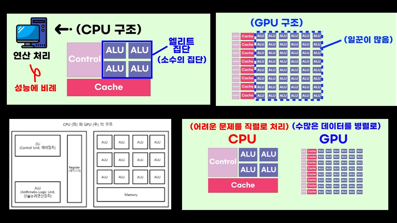 CPU와 GPU의 내부 구조를 비교해보면, CPU는 복잡한 연산을 순차적으로 처리하는 반면, GPU는 병렬 처리를 통해 많은 단순 연산을 동시에 처리할 수 있습니다. 이를 통해 GPU는 이미지 렌더링과 같은 작업에서 큰 성능 이점을 제공합니다.