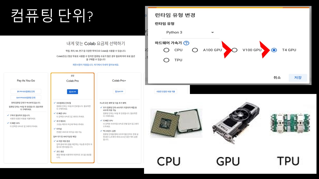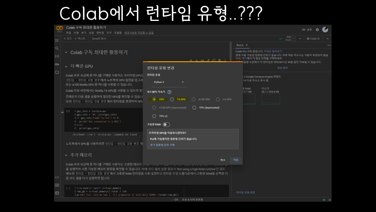 머신러닝, 딥러닝을 배울때 colab pro에서의 cpu, gpu 선택의 차이가 궁금했기 때문이다.