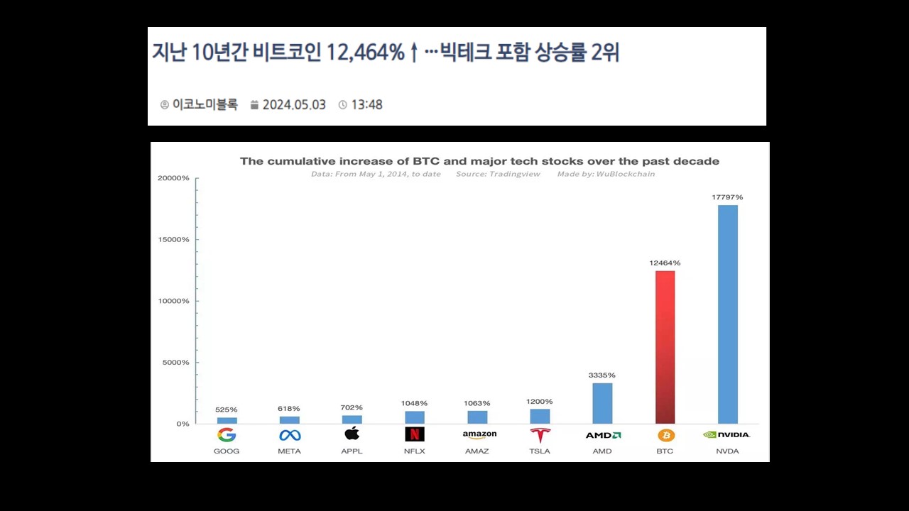 우블록체인의 분석에 따르면, 엔비디아는 지난 10년간 17797% 상승하며 1위를 차지했습니다. 이는 비트코인의 12464% 상승보다도 높은 수치입니다.