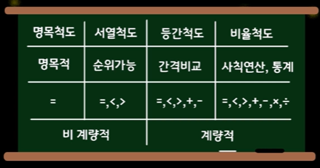 | 양적 척도 | 등간 척도 | 간격비교 | 범주 = | 순서 <> | 상대적 크기 + - | |