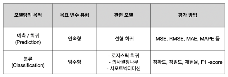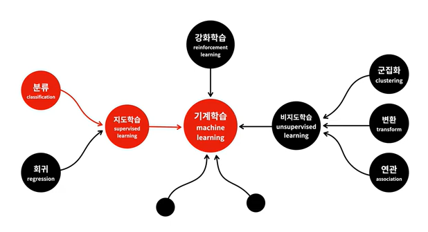 | 지도학습 | 모델의 종류 (분류 기준) 지도학습의 경우 머신러닝을 통해 예측하고자 하는 값이 실수(숫자) | 범주형 변수에 따라 회귀 모델과 분류 모델로 나뉜다. |